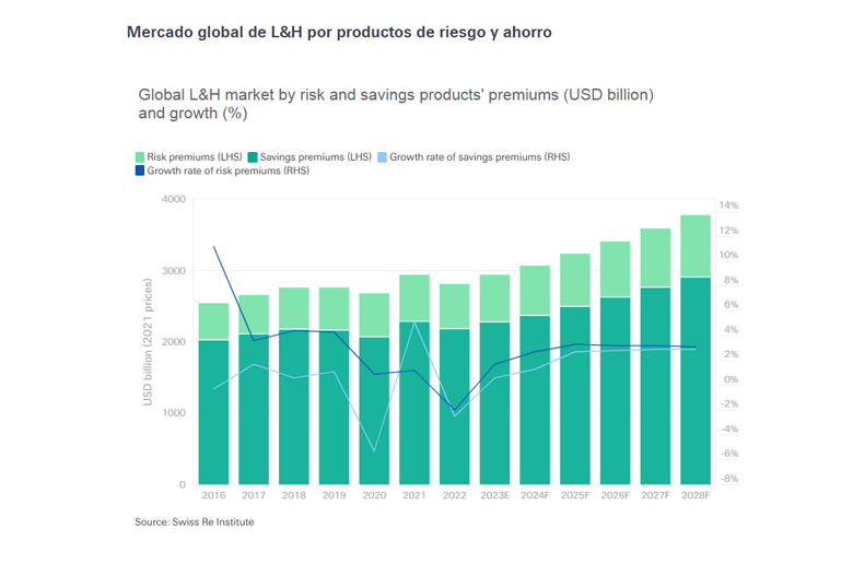 En los seguros de vida, el aumento de los salarios y las tasas de interés en los mercados avanzados está creando vientos de cola favorables para el crecimiento y la rentabilidad, incluida la demanda de rentas vitalicias y productos de transferencia de riesgo de pensión. También vemos nuevos grupos de riesgo de vida en Hong Kong como resultado de la reapertura de China. Las primas de los productos de ahorro globales deberían crecer, impulsadas por una ganancia estimada del 4,3% en los mercados emergentes.