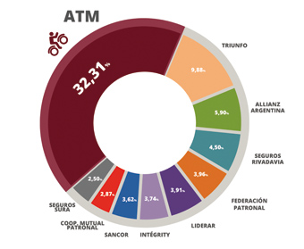 ATM, la primera compañía exclusiva de seguros de motos del mundo y la principal de Argentina, una vez más reafirma su liderazgo absoluto en el mercado asegurador. Según lo informó la SSN, Superintendencia de Seguros de la Nación, correspondiente al segmento de Motovehículos, en su último reporte anual del mercado del año 2017, ATM se ubica en la posición número 1 del Ranking por Ramos. Este reporte muestra que ATM no sólo logró en otro año consecutivo consolidar su liderazgo, sino que las cifras del market share la ubican con una gran ventaja respecto de las otras compañías del sector del mismo segmento. Así, ATM se posiciona a más de 20 puntos de diferencia, en relación a la empresa que tiene el segundo lugar en el mismo ranking. El Top Ten Anual de aseguradoras de motos se conforma según el grá?co que acompaña esta información.