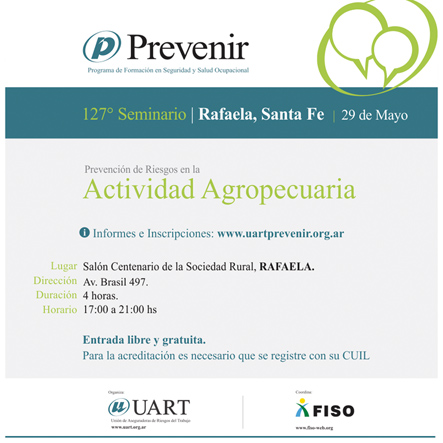 El pasado martes 29 de mayo la Unión de Aseguradoras de Riesgos del Trabajo llevó a cabo en la ciudad de Rafaela, Santa Fe, un nuevo seminario de su ciclo Prevenir, coordinado por FISO, en el que expertos trataron «La Prevención de Riesgos en la Actividad Agropecuaria». En el mismo disertó la Ing. Agr. Liliana Bulacio acerca del uso responsable de fitosanitarios y la Med. Vet. Delia Perata respecto del manejo de animales. El evento tuvo lugar entre las 17:00 hs. y las 21:00 hs. en el Salón Centenario de la Sociedad Rural de Rafaela, ubicado en Av. Brasil 497 de la citada ciudad. Las actividades del Ciclo Prevenir son libres y gratuitas, pero requieren acreditación previa mediante número de CUIL.