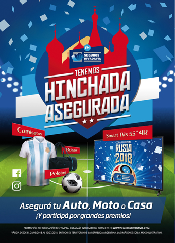 A pocos días del comienzo del Mundial de Fútbol Rusia 2018, la Aseguradora presentó su nueva promoción «Hinchada Asegurada». A fines de mayo, Seguros Rivadavia produjo el lanzamiento de este nuevo concurso, el cual se extenderá hasta el martes 10 de julio y será válido para todo el territorio nacional. El mismo está destinado a todos los asegurados actuales y a aquellos que contraten una póliza de automotores o motos en sus planes Premium, y/o de Combinado Familiar, en todos sus planes, quienes estarán participando de sorteos semanales por Smart TVs 4K de 55 pulgadas.