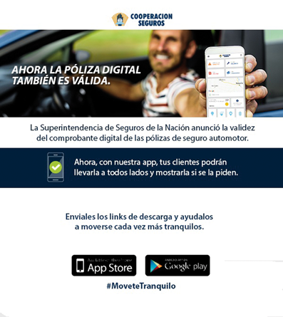 La Superintendencia de Seguros de la Nación anunció que ya es válido el comprobante digital de las pólizas de Seguro Automotor, lo que posibilita al usuario mostrar esta documentación desde cualquier dispositivo. Cooperación Seguros pone a disposición de sus asegurados una aplicación móvil que les permite acceder a esta información desde cualquier momento y cualquier lugar. La app ofrece además numerosas funcionalidades relacionadas con el servicio de la Compañía, desde la solicitud de auxilio mecánico geolocalizada hasta el envío de documentación en caso de siniestros, como así también la consulta de toda la información relativa a sus pólizas y otras funcionalidades accesorias.