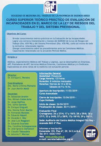 La Sociedad de Medicina del Trabajo de la Provincia de Buenos Aires anuncia el inicio de inscripción desde el 11 de marzo a su curso teórico-práctico de evaluación de discapacidades, cuyo objetivo es brindar las herramientas necesarias para una correcta interpretación y manejo del BAREMO de la Ley de Riesgos del Trabajo y del Sistema Previsional, como así también otorgar conocimientos sobre los procedimientos ante Comisiones Médicas y la actuación pericial médica.