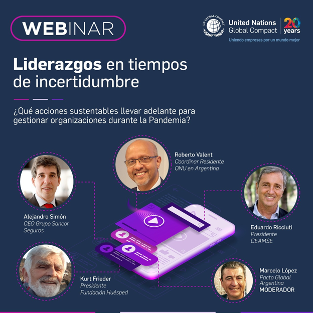 El pasado 6 de mayo, el Pacto Global organizó una charla entre representantes de empresas y entidades del país para hablar del liderazgo en estos tiempos de crisis generada por la pandemia del COVID-19. Este fue el primero de una serie de webinarios organizada por la Red Argentina del Pacto.