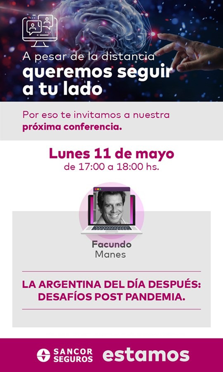 La misma, titulada “La Argentina del día después: desafíos post pandemia”, se llevará a cabo el 11/05 y estará a cargo de Facundo Manes, una de las figuras más prominentes de las neurociencias a nivel mundial. Durante la disertación, el destacado neurocientífico abordará los efectos psicológicos del aislamiento social preventivo, brindará algunas claves para aliviar el estrés de la incertidumbre y proyectará los retos que las personas deberán afrontar una vez que la amenaza del COVID-19 quede en el recuerdo.