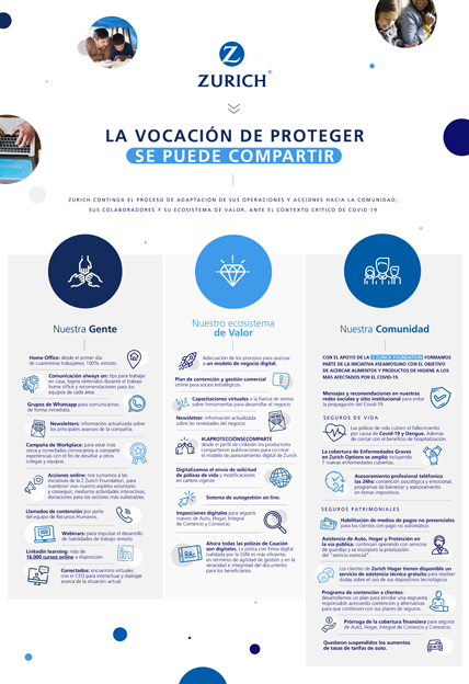 En su condición de grupo asegurador líder en el mundo y con el propósito principal de reforzar su cercanía con las personas y las comunidades, Zurich continúa con sus iniciativas globales y locales para ayudar a mitigar los efectos negativos de la pandemia mundial adecuando los procesos para avanzar a un modelo de negocios digital dirigidos a sus clientes.