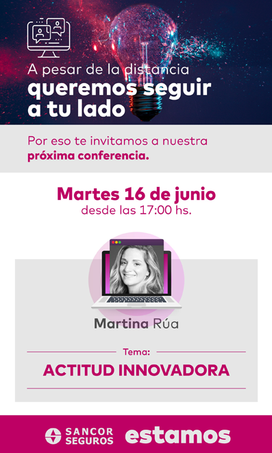 El pasado martes 16 de junio, los Productores Asesores de Sancor Seguros participaron de un webinario sobre “Actitud innovadora”, donde se abordó cómo nos está transformando la pandemia, qué habilidades se hacen esenciales y qué puede quedar de este tiempo de aprendizaje para nuestras vidas y trabajos futuros. Esta charla fue dictada por Martina Rúa, periodista con 21 años de experiencia en la industria de la comunicación. Investiga sobre innovación, productividad y tecnología, y es coautora del libro “La Fábrica de Tiempo”, sobre productividad personal.