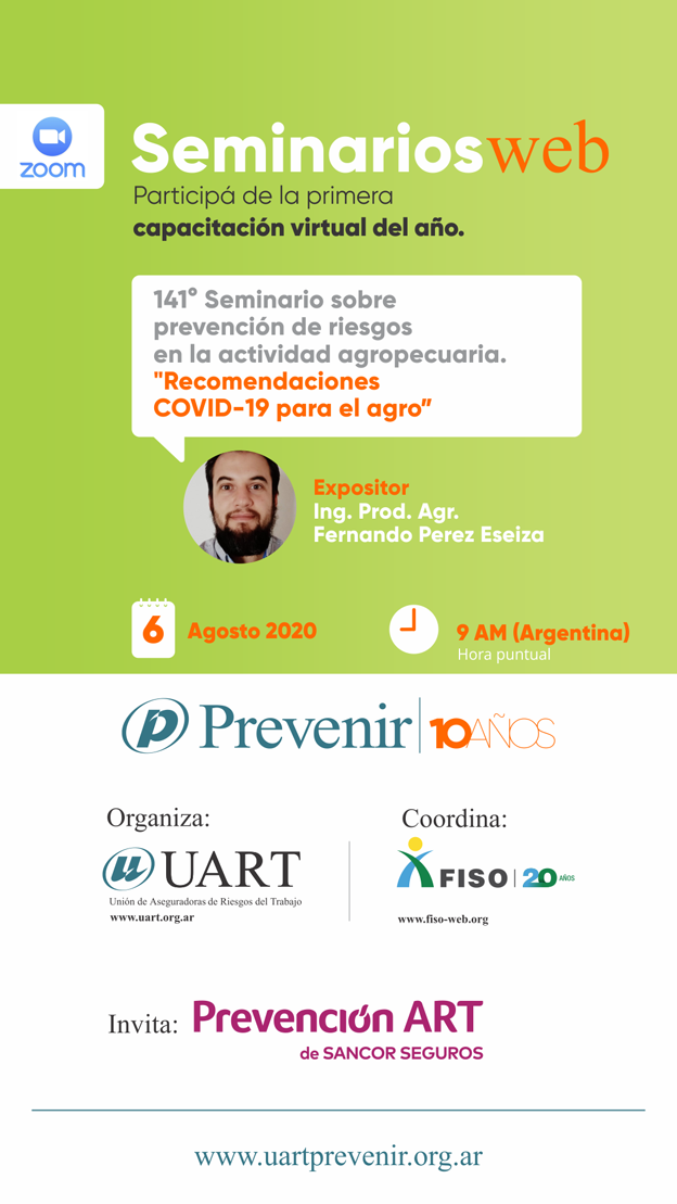 Prevención ART invita a todas las empresas aseguradas a participar del seminario web sobre “Recomendaciones COVID-19 para el agro”, como parte de un ciclo de capacitaciones virtuales que organiza la Unión de Aseguradoras de Riesgos del Trabajo (UART).