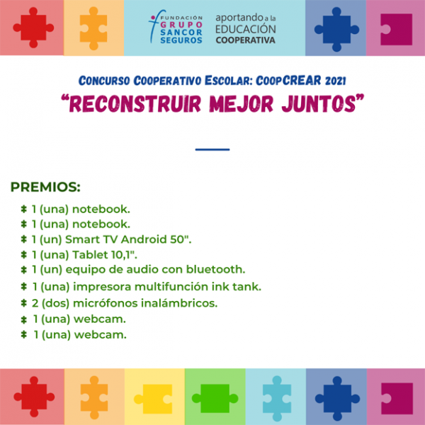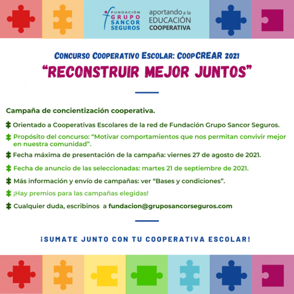Bajo el lema “Reconstruir Mejor Juntos”, Fundación Grupo Sancor Seguros organiza el concurso “CoopCREAR 2021” e invita a participar a alumnos cooperativistas que forman parte de las Cooperativas Escolares de la Red de la Fundación a nivel país, quienes tendrán que realizar una campaña de concientización cooperativa.