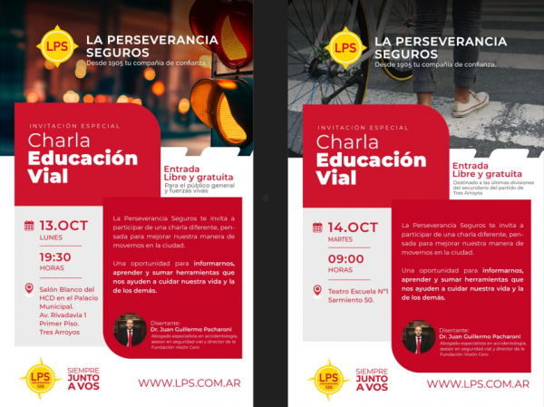 Los festejos continúan durante el mes de octubre, en el que tendrán lugar 2 encuentros organizados por La Perseverancia Seguros, para seguir educando sobre seguridad vial, en la localidad de Tres Arroyos. La entrada es libre y gratuita, y los participantes podrán informarse, aprender y adquirir herramientas que los ayuden a mejorar su manera de moverse por la ciudad. La primera charla tendrá lugar el día lunes 13 de octubre a las 19:30 hs, en el Palacio Municipal, mientras que el segundo encuentro destinado a estudiantes secundarios se llevará a cabo el martes 14 de octubre en dos turnos a las 9 hs y a las 15:00 hs., en el Teatro Escuela N°1. El disertante, en ambos casos, será el Dr. Juan Guillermo Pacharoni, abogado especialista en accidentología, asesor en seguridad vial y director de la Fundación Visión Cero.