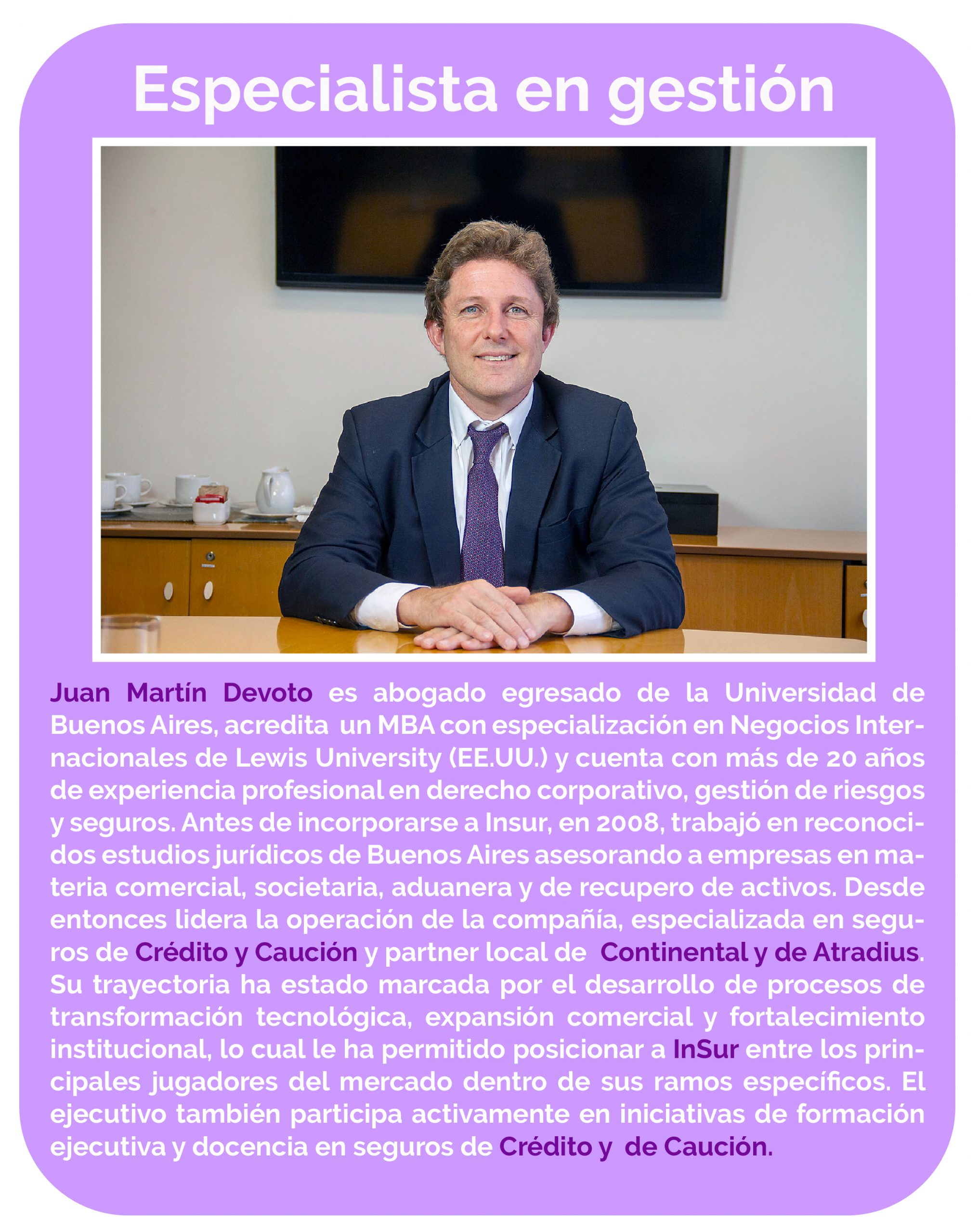 Esa es la estrategia definida por el timonel de InSur para mantener el posicionamiento en seguros de Crédito y crecer en Cauciones, los dos ramos en los que opera. Durante el último ejercicio, la compañía alcanzó un volumen de producción de u$s 21 millones. “Para 2026 buscamos generar una mejora en ventas de entre un 5 y un 10%, pero principalmente trabajar sobre la rentabilidad”, anticipa Juan Martín Devoto, gerente general de la compañía.