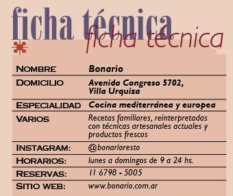 Ubicado en una esquina de Villa Urquiza, Bonario es un restaurante que amalgama lo clásico con lo contemporáneo. Inspirado en los sabores tradicionales de la cocina mediterránea y europea, este espacio, creado por un grupo de amigos que comparte el amor por la buena mesa y los recuerdos en torno a ella, ofrece una propuesta que resalta la frescura de los ingredientes locales de temporada con una presentación moderna, sin perder el espíritu casero que evoca las comidas compartidas en familia.