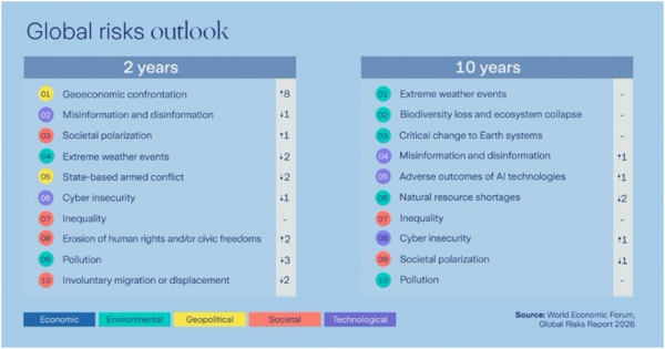 Mientras que la confrontación geoeconómica, los conflictos armados entre estados, los eventos climáticos extremos, la polarización social y la desinformación y la información errónea fueron identificados por los encuestados como los cinco principales riesgos inmediatos en 2026, la desinformación y la polarización social ascendieron al segundo y tercer lugar en la perspectiva a dos años.
